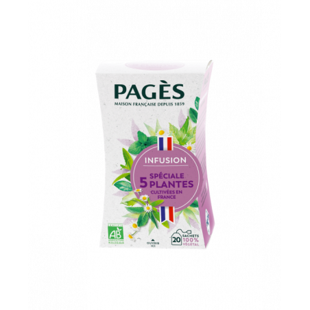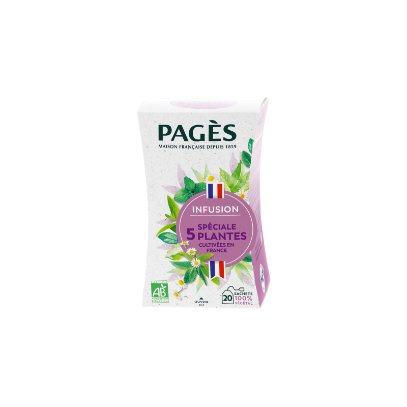 Notre iconique infusion Bio Spéciale 5 Plantes rejoint notre gamme de recettes 100% françaises ! Pagès participe au redéploiement de la filière des plantes françaises en collaboration avec une coopérative d'agriculteurs bio. Cet assemblage subtil mêle la Verveine, la Mélisse, la Menthe poivrée, la Camomille et les feuilles d'oranger. Laissez-vous séduire par les notes à la fois citronnées, douces et gourmandes de plantes qui poussent au plus près de chez vous. Pagès maîtrise à la perfection l'art de l'assemblage des plantes.