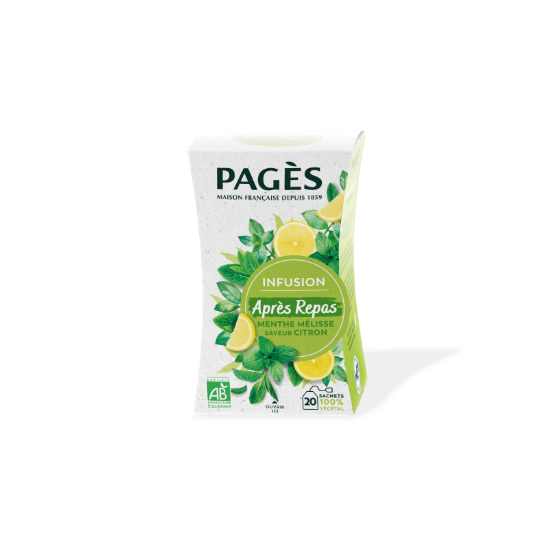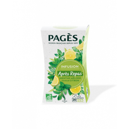 L’infusion Bio Après Repas saveur Citron de Pagès se caractérise par ses notes fraîches et acidulées de Menthe et de Citron. On la consomme idéalement à la fin d’un repas grâce à la Menthe qui favorise la digestion. L'Anis et la Mélisse, au goût naturellement citronné, se marient subtilement aux autres plantes, pour apporter une touche de douceur à cette infusion.