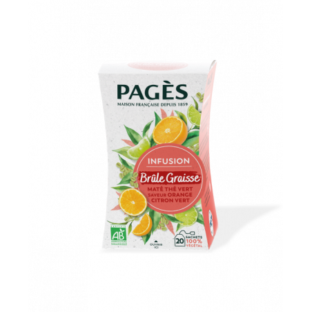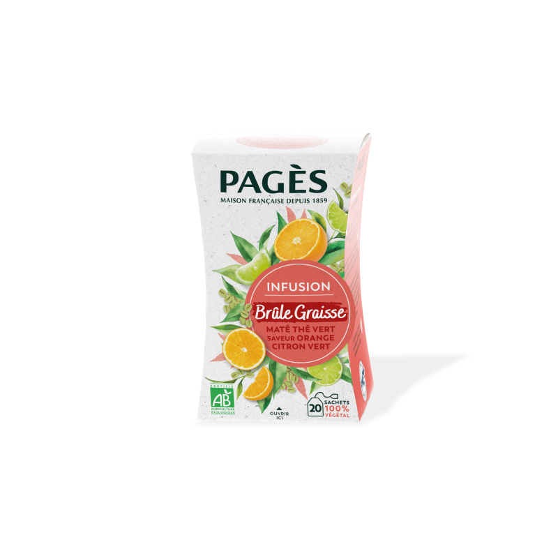 Le Thé vert réputé pour aider au contrôle du poids, se mêle au Maté, au Café vert et aux graines de Guarana dans cette infusion Brûle Graisse Bio. Un cocktail savamment relevé par une douce note d’Orange et la saveur du Citron. Dans cette recette, Pagès infuse le bon goût des plantes, pour une infusion saine et naturelle.