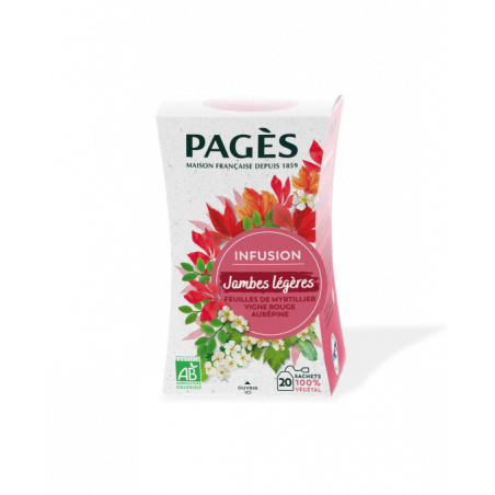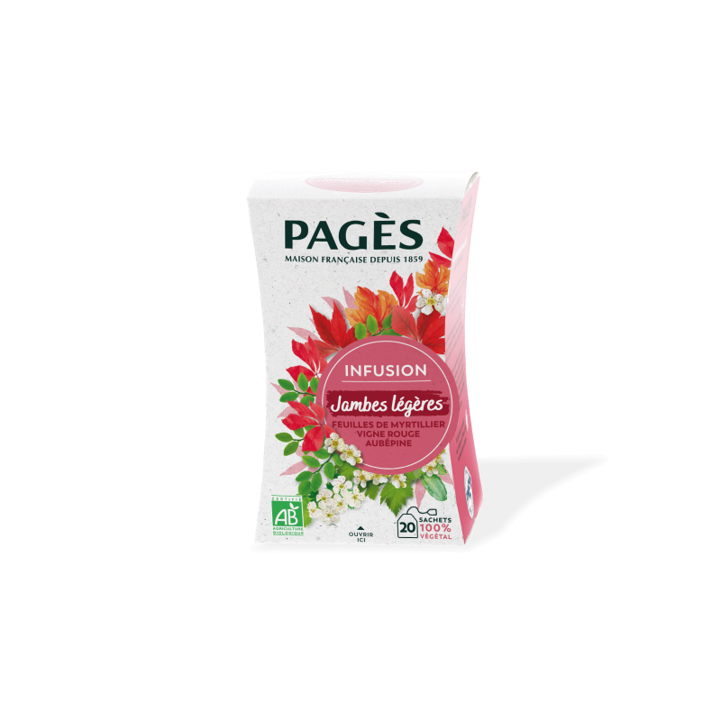 L’infusion Jambes Légères Bio de Pagès a été élaborée dans la pure tradition herboriste : feuilles de Myrtille, connues pour favoriser la sensation de jambes légères, fleur d’Aubépine, feuilles de Cassis, feuilles de Mûre, feuilles de Vigne rouge… Notre recette, créative et généreuse, est le résultat d’un savant dosage de plantes, pensé pour votre bien-être. La Cardamome et l’huile essentielle d’Orange apportent avec subtilité une touche d’originalité à cette infusion.
