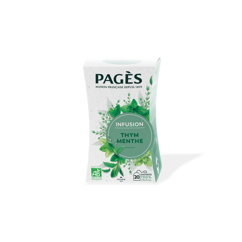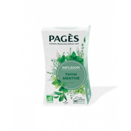 L’infusion Bio Pagès Thym Menthe associe deux plantes emblématiques de l’herboristerie. Le Thym, aux notes provençales prononcées se marie idéalement à la fraîcheur agréable de la Menthe dans cette recette. Élaborée dans la pure tradition herboriste, cette infusion aux saveurs naturelles et intenses révèle le bon goût des plantes classiques de l’infusion. Issues de l'agriculture biologique et 100% françaises, les produits qui composent cette boisson rappellent la nature.