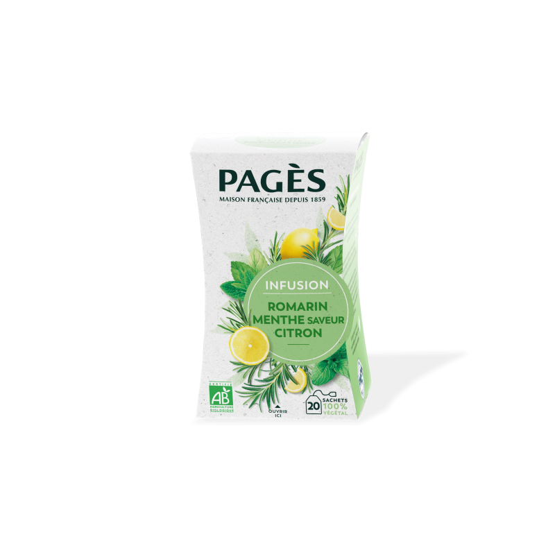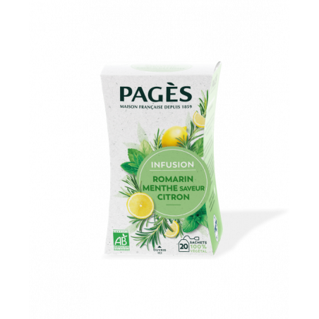 L’infusion Bio Pagès Romarin Menthe Citron est une recette originale et riche en saveurs. Le Romarin présente un goût provençal prononcé et apporte de l’originalité à ce savant mélange. Indétrônable de l’infusion, la Menthe donne une note de fraîcheur agréable à cette boisson. Le Citron, vient parfaire cette association de plantes. Il suffit de faire infuser le produit quelques minutes dans l'eau chaude pour sentir son parfum si naturel, qui rappelle celui des plantes de notre jardin.