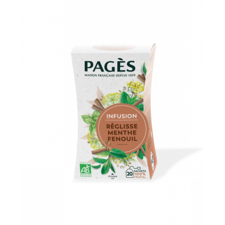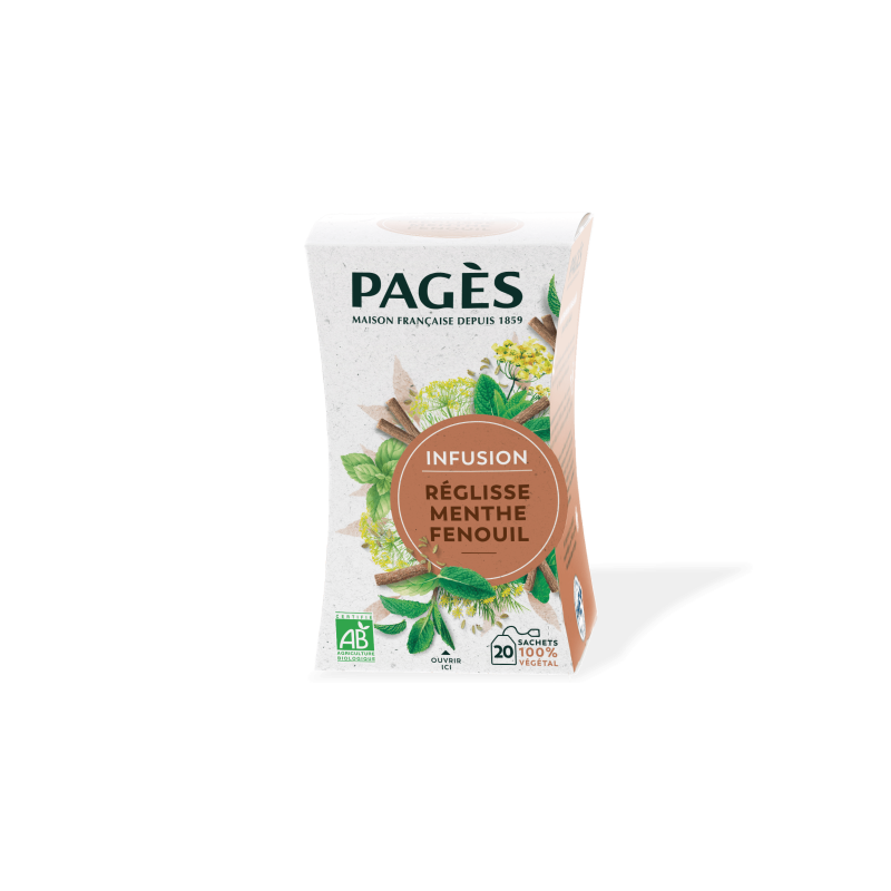 Pagès associe dans son infusion Bio, la Réglisse, la Menthe et le Fenouil. La Réglisse revêt des notes sucrées très gourmandes. Le Fenouil, à la saveur anisée, est une plante assez caractéristique. La Menthe présente une grande fraîcheur, on l’utilise souvent pour retrouver une sensation de légèreté après le repas. Cette recette, c’est l’infusion même du bon goût des plantes : un juste dosage de saveurs singulières, pour une expérience unique.