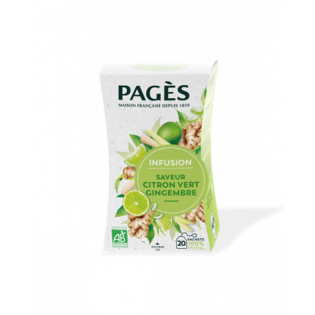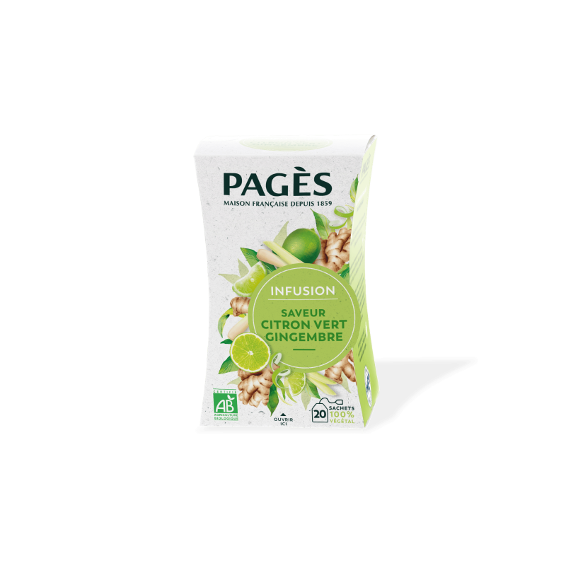 Pagès associe dans son infusion Bio le Gingembre aux notes de Citron et de Citron vert. Ce mariage acidulé vient chatouiller vos papilles avec l’exotisme du Gingembre et la fraicheur des deux Citrons. Mélange d’épices et d’agrumes, cette recette Pagès offre un instant de dégustation naturel, original et intense, plein de saveurs.