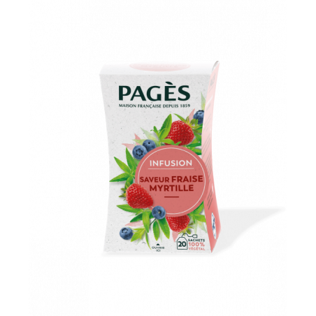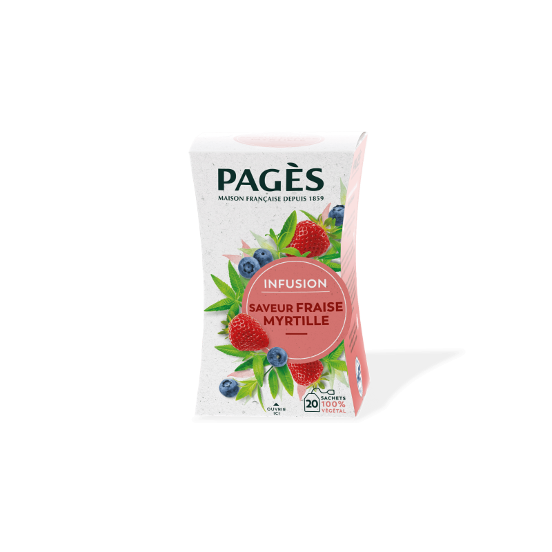 Pagès revisite un grand classique : l’infusion fruits rouges et propose une création originale, à la fois gourmande et naturelle. L’infusion saveur Fraise Myrtille se compose d’un mélange de fruits et de plantes traditionnelles. Ce produit se distingue par la saveur réconfortante de la Fraise et de la saveur Myrtille et révèle une boisson délicieuse !