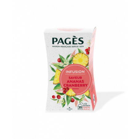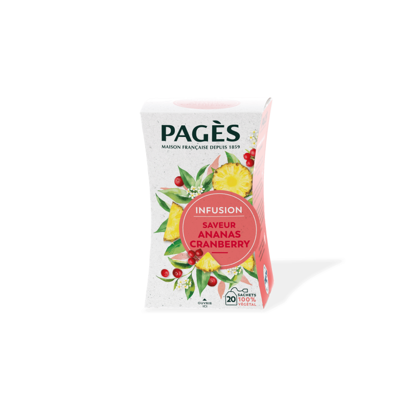 Pagès associe la Reine des Prés et le Thé vert aux arômes naturellement gourmands de l'Ananas et de la Cranberry dans cette recette aussi originale qu'emblématique. Cette création au juste dosage de plantes et arômes révèle une infusion délicieuse aux notes acidulées.