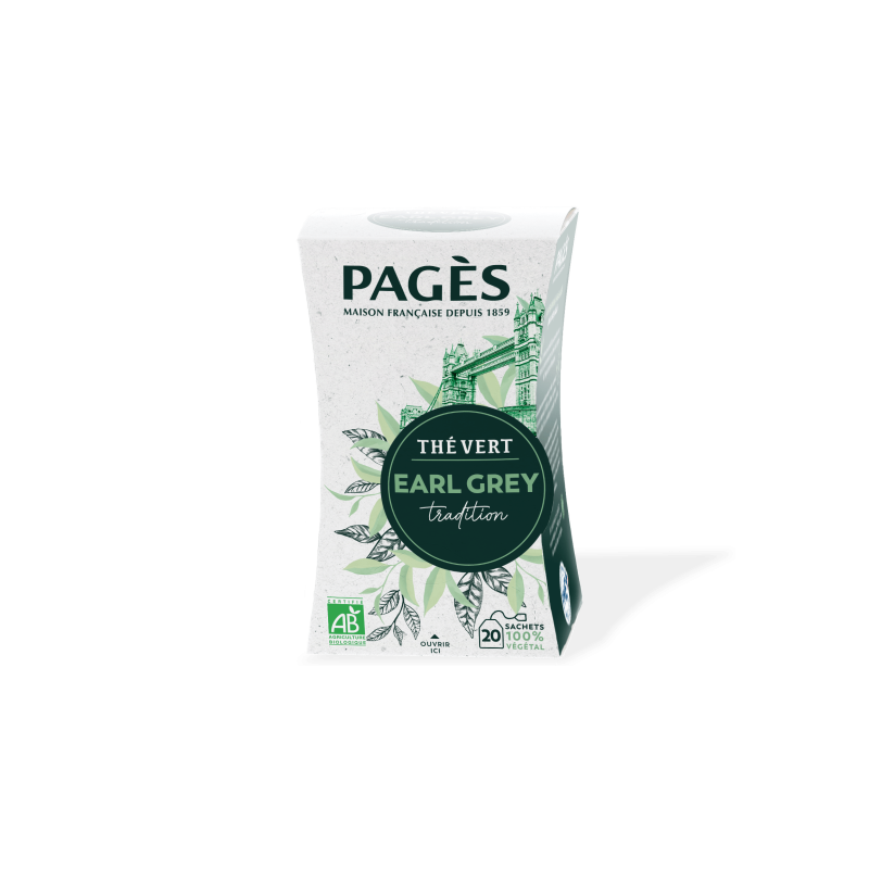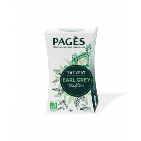 Ce thé Bio est une variation de l’emblématique Earl Grey sur une base de Thé vert. Il porte le nom de celui qui l’a découvert : le compte Grey, « Earl Grey » en anglais. Le thé vert Earl Grey Bio de Pagès est issu des Grands Jardins. Il allie la finesse du Thé vert à la saveur envoûtante de la Bergamote, agrume méditerranéen qui s’apparente à une petite Orange de couleur jaune. Son infusion laisse en bouche des notes caractéristiques.