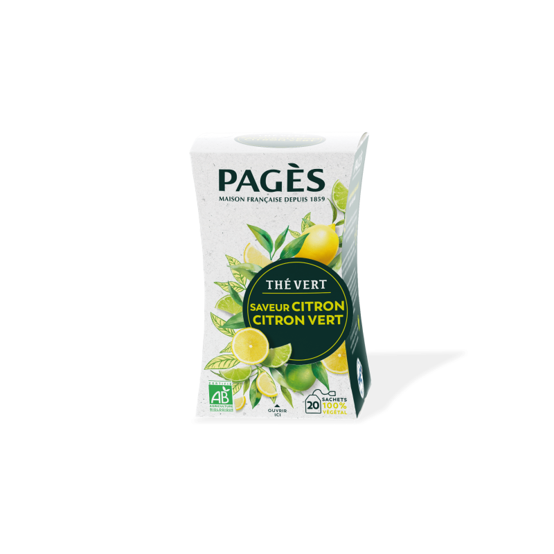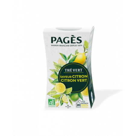 Pagès associe deux saveurs inséparables dans cette recette Bio : le Thé vert et la saveur du Citron. Le thé sélectionné ici est issu de jardins Bio exceptionnels. Ce mélange allie la finesse du thé vert aux notes puissantes et acidulées du Citron jaune et du Citron vert. Cette boisson rafraîchissante et délicieuse a été élaborée dans un esprit de simplicité et de naturalité. L’infusion de ces agrumes donne à ce produit un goût caractéristique et gourmand.