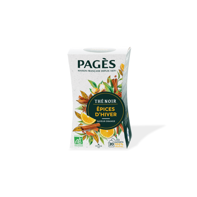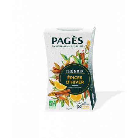 Le thé noir Epices d'Hiver Bio Pagès allie la douceur du thé noir aux saveurs intenses des épices. Cette recettes allie habilement la Cannelle et la Badiane à un mélange d'épices pour un moment de dégustation original et intense. Ce cocktail hivernal se boit idéalement lors de la saison froide, dès le matin. Ce thé noir aux épices saura réveiller les papilles de ceux qui ont besoin d'un petit coup de reps lors des longues journées d'hiver.